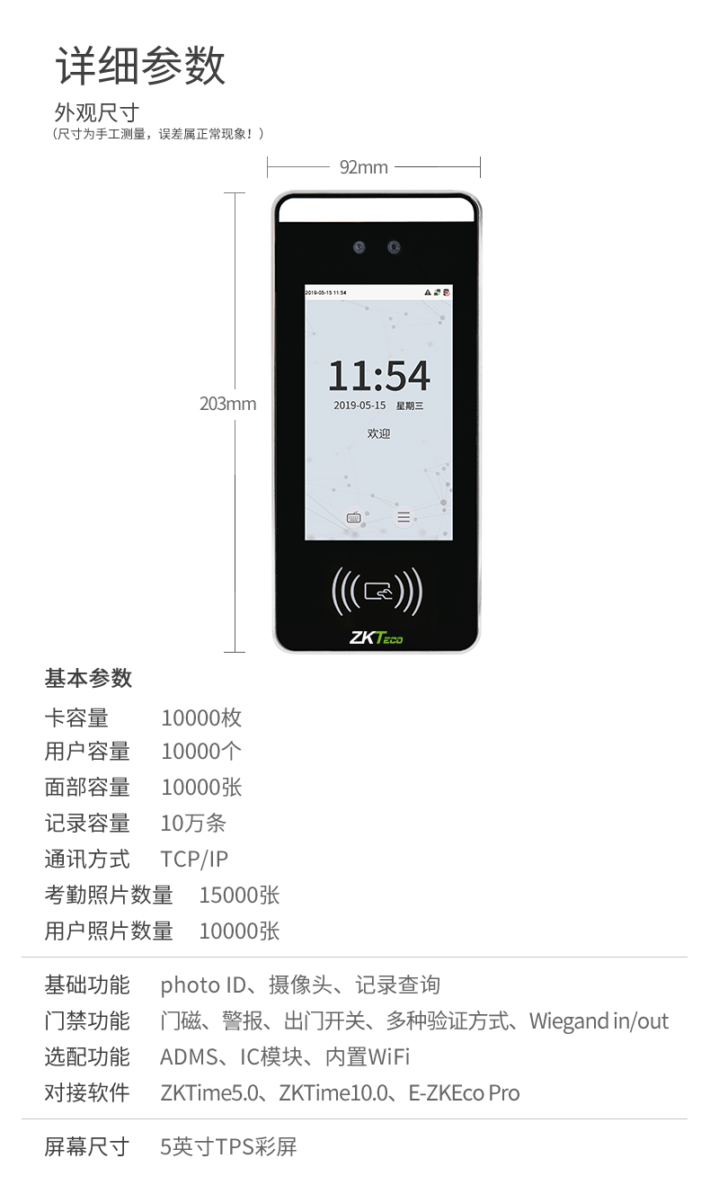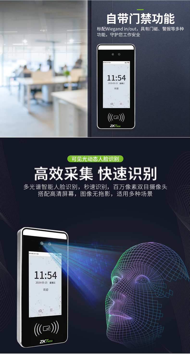 中控xface60非接觸式刷卡門禁是中控智慧根據(jù)市場(chǎng)需求,全新推出的多光譜智能考勤機(jī),區(qū)別于以往的人臉靜態(tài)識(shí)別,具有快速讀取、動(dòng)態(tài)識(shí)別的功能。xFace60采用Linux操作系統(tǒng),具有刷卡認(rèn)證、人臉識(shí)別等驗(yàn)證方式,簽到多種選擇,輕松考勤;中英文輸入法,輕松編寫。標(biāo)配Wiegand in/out,具有門磁、報(bào)警等多種功能,守護(hù)您工作安全。